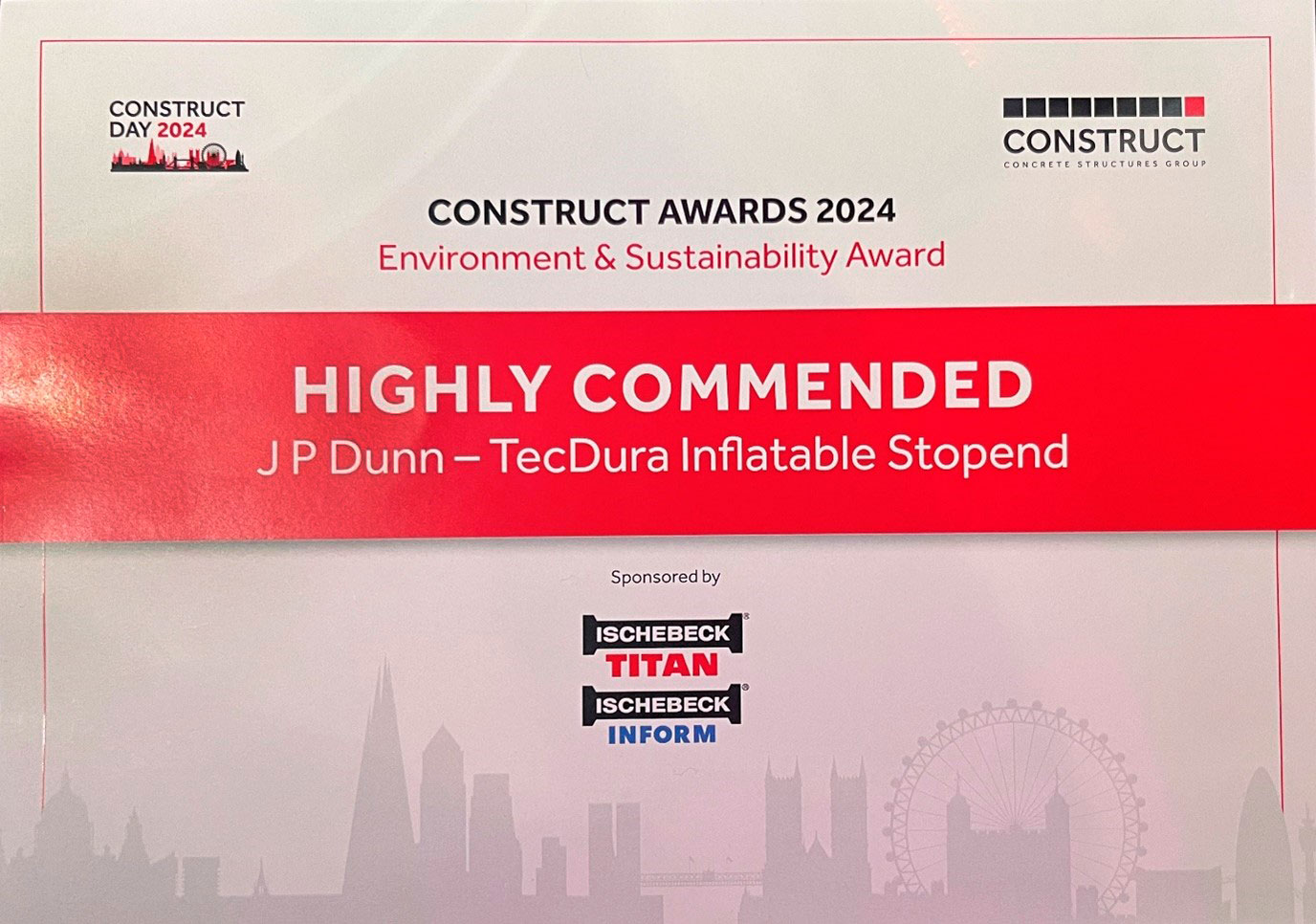 JP Dunn also received a highly commended Environment & Sustainability award for the TecDura inflatable stopend. The TecDura inflatable stopend streamlines the concreting process, offering quick installation and removal by inflating to 8 PSI. It allows immediate continuation of work after applying a retarder. This reusable stopend reduces waste and environmental impact, compared to single-use timber alternatives. For further details contact James@tecdura.com