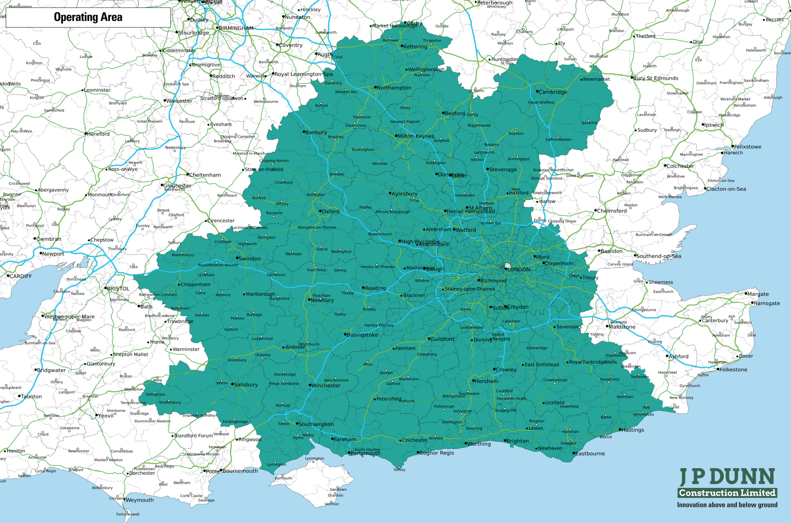 J P Dunn Construction work in London and the Home Counties, to the extent shown on the operating map below. We have management teams located in Oxfordshire, Buckinghamshire, Bedfordshire, Surrey, Sussex, and Hertfordshire so are well positioned to service projects to all of these locations.